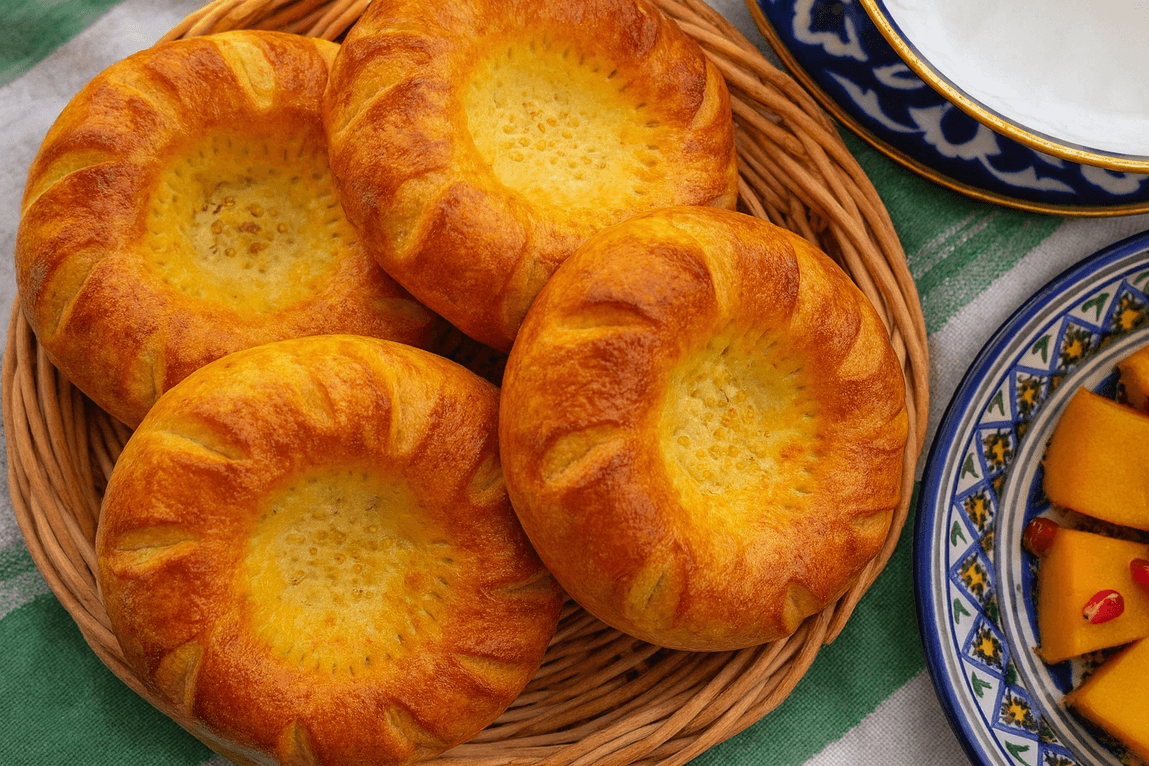 Traditional Uzbek round flatbread with a soft, chewy interior and a crispy crust