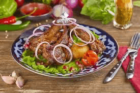 Kazan Kebab — tender, slow-cooked meat and golden potatoes layered with roasted red onion, simmered in a traditional kazan (cast-iron pot) and sealed in its own juices for a rich, authentic Central Asian flavor.